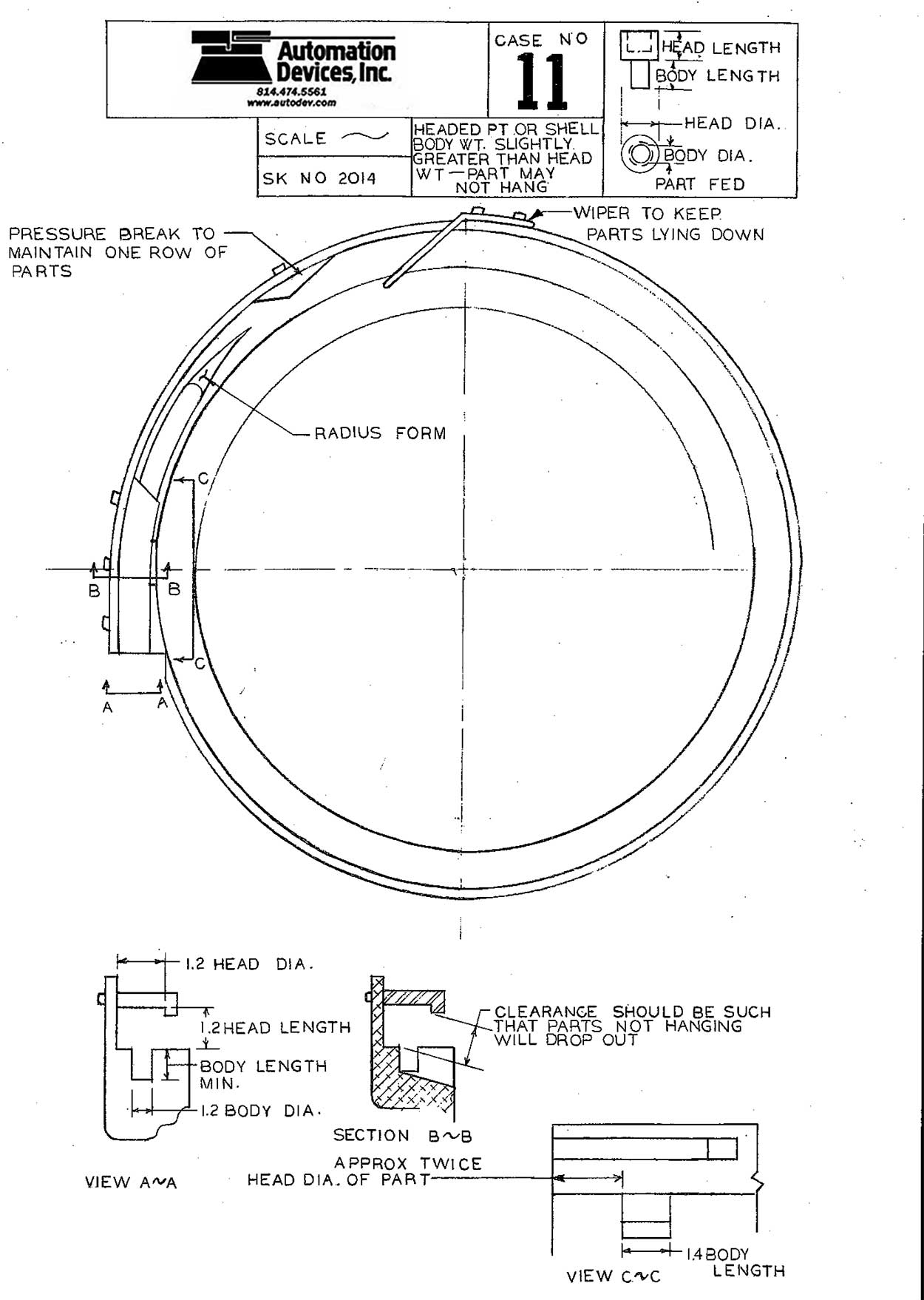 Parts are allowed to travel up the bowl helix randomly until they reach the last quadrant of the bowl. A wiper is the first piece of tooling to knock parts standing on their head over. A pressure break wedge allows the overflow parts to return to the bowl while allowing a single line of parts to enter a shallow linear groove. Too many parts in the groove decreases the feed rate and increases the rejection rate. This groove section pre-aligns the parts linearly, assisting in the next orienting sequence, which is the hang sequence. Parts traveling with the head leading and trailing will both hang in the machined square groove. A cover is positioned overhead to contain oriented parts. A spill-off is machined at the midpoint of the cover to reject misoriented parts back into the bowl. Due to the relief granted by the spill-off and the pressure break, this tooling technique allows the bowl to run under back pressure and does not require electronic back pressure control.